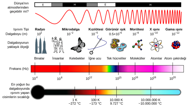 Bu şema elektromanyetik spektrum olarak bilinir. Şemada değişen dalga boyları (Wavelength), en üst sırada gösterilmiş, bu dalgaboylarını temsilen şekiller yerleştirmişler, mesela radyo (radio) dalgaları binaların veya insan boyunun yüksekliği kadar geniş dalga boyuna sahiptir. Radyo dalgaları, mikrodalga (microwave), kızılötesi(infrared), görünür dalga boyu (visible), ultraviyole, x-ışınları ve gama ışınları da sırasıyla yukarıdaki spektrumde gösterilmiş. Bizim gözle görebildiğimiz dalgaboyunun, bütünün çok az bir yerini kapladığını görüyorsunuz. Bunun altında da dalgaların sıklık (frekans – frequency) ve enerji bilgileri var. Bu tablonun 1800 lü yıllar için oldukça erken olduğunu ekleyelim, sadece dalganın frekansının belirlenmesinin ardından, iş nerelere geldi, onu görelim istedim.