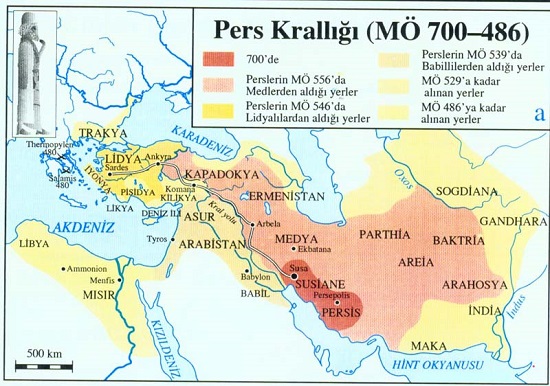 İ.Ö. 546 geldiğimizde ise, Perslerin istilası başlamıştır ve o dönemde Helenler ile Persler arasındaki Biga Çayı (Granikos) Savaşı, farklı kaynaklarda anlatılmaktadır. Persler Batı Anadoluyu ele geçirdikten sonra, kolayca yönetebilmek için araziyi bölmüş ve dukalıklar oluşturmuşlardır (s.88). Perslere karşı bir Helen Birliği sağlama niyetiyle, Büyük İskender’in babası II.Phlipos, İ.Ö. 338 harekete geçer , ancak İ.Ö.336’da öldürülünce, yerine oğlu geçer. Büyük İskender (III. Aleksandros), Perslerle savaşmak üzere Çanakkale boğazını geçtiğinde, Makedonya ordusu Perslerle ilk savaşını gerçekleştirir, ilk toprağı Perslerden alır ve Ephesos’a doğru ilerler.